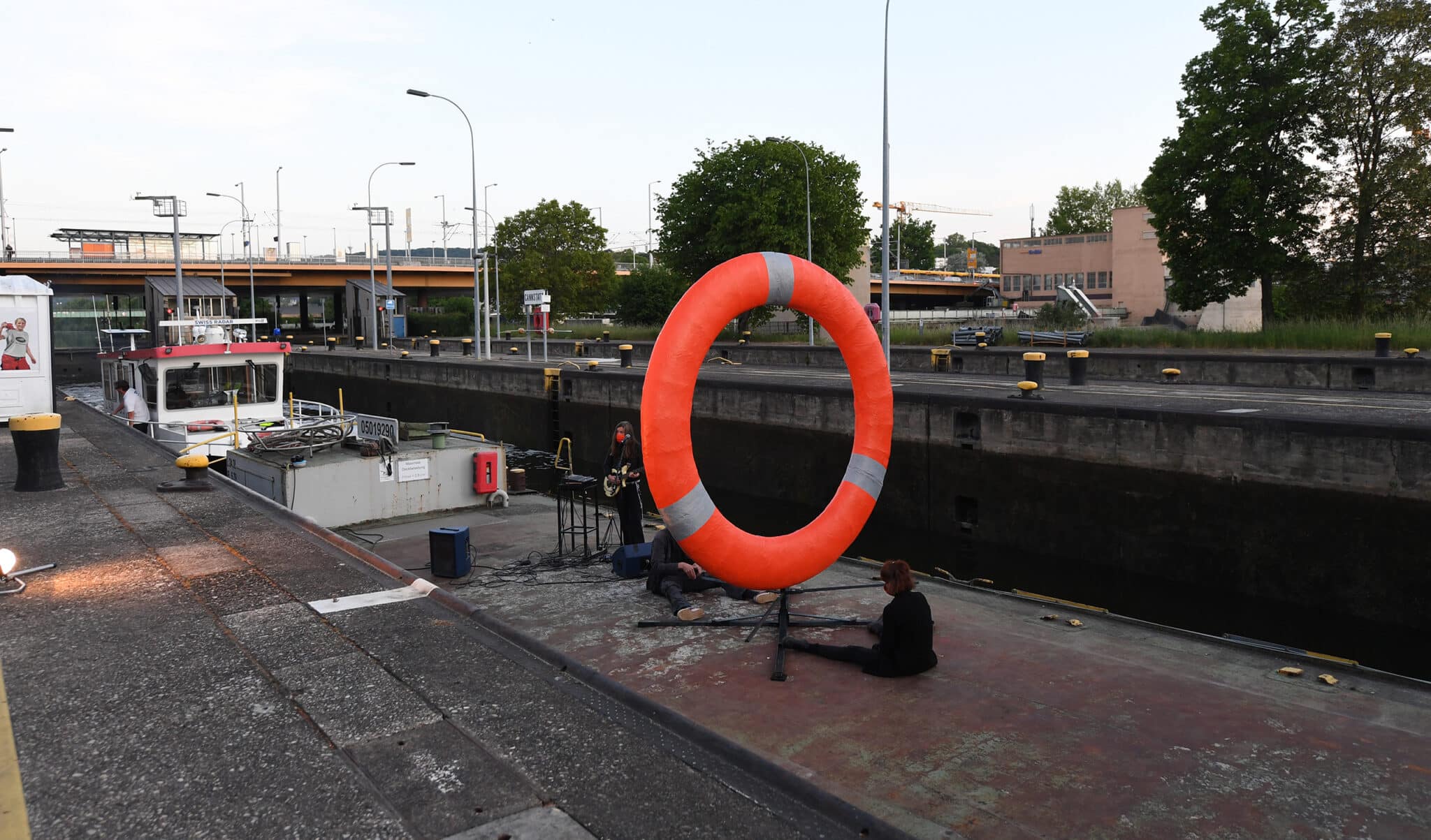 An abstract artistic view of the river was provided by various campaigns by the artists at Kunstverein Wagenhalle: A performance entitled ›Auswerfen‹ by Ute Beck and Karin Sauerbier showed the hidden treasure of the Neckar, with the artists recovering their ‘Neckar gold’ in the form of a large golden net at the ›Berliner Steg‹ jetty. Thomas Putze used music to keep himself above water: a floating acoustic guitar on the Neckar prevented him from going under and accompanied his siren’s song in a project entitled ›Abtauchen‹. The artist Iradj Esmailpour Ghoochani threw a Hölderlin-inspired message in a bottle into the river, while the weir in Bad Cannstatt designed by Paul Bonatz was the site for ›Auftauchen‹, a project that saw a lifebuoy emerge from the water accompanied by musical vibes.