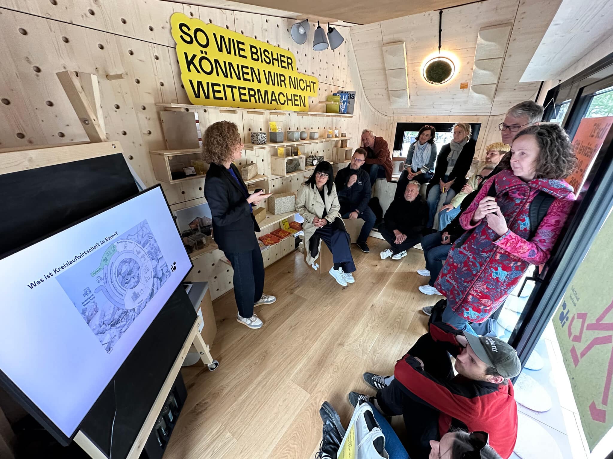 Gestern um 17 Uhr gab es ein kleines Pre-Opening. Stefanie Weavers vom IBA’27-Team stellte den Circular Construction Hub vor. Robert Böker vom Team w∞d.ii sprach über Konzept und Materialien des mobilen Lernraums.