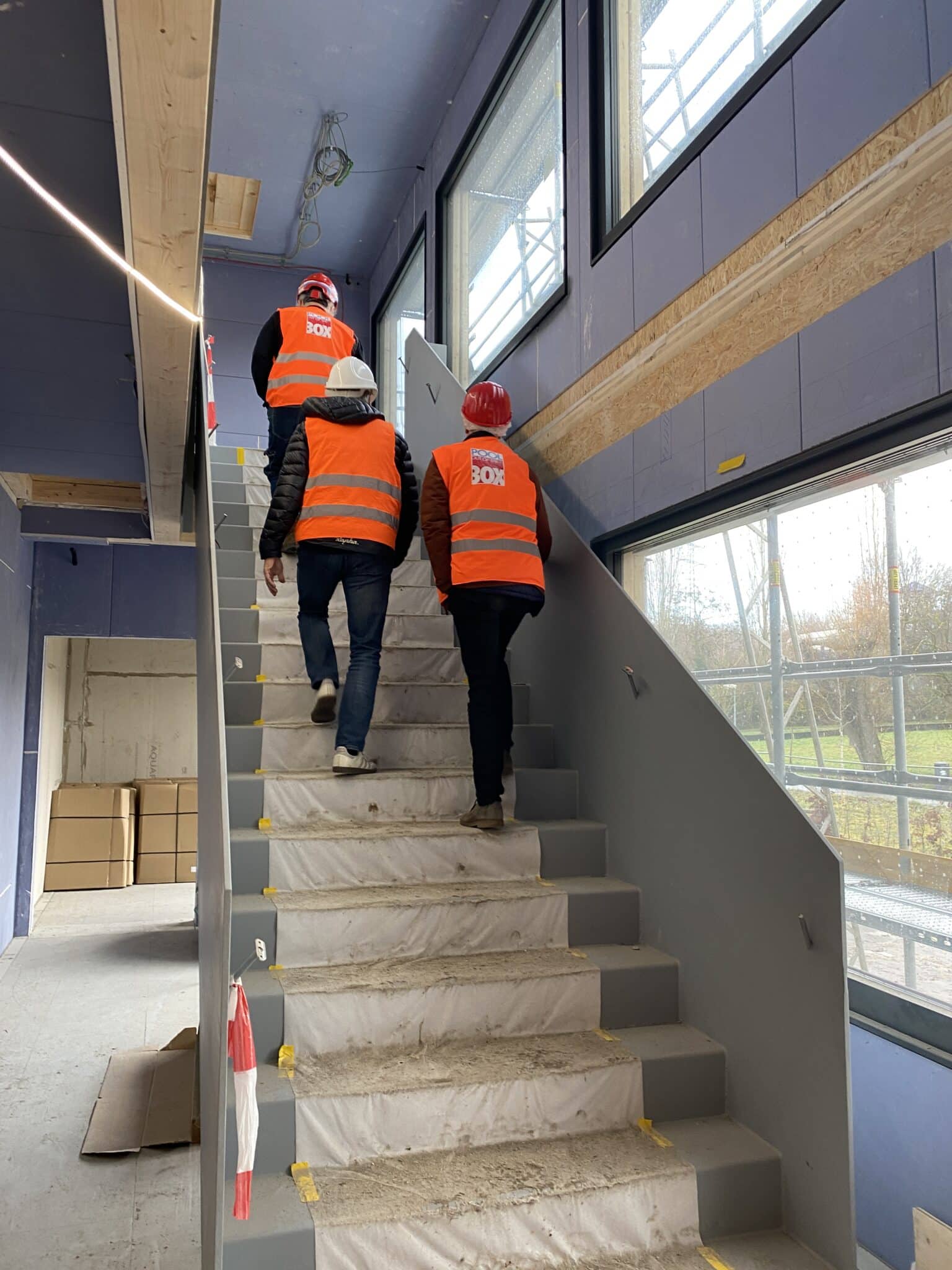 Bei einer Baustellenführung zeigten Joachim Maier von POOL out of the BOX, Ulrich Tillmann und Petra Steiner von 4a Architekten, Andreas Hofer und Tina Muhr (IBA’27) den raschen Baufortschritt, erläuterten die täglichen Erkenntnisse aus dem modularen Bauprozess und teilten die vielfältigen Learnings, die dieses Pilotprojekt jeden Tag liefert.
