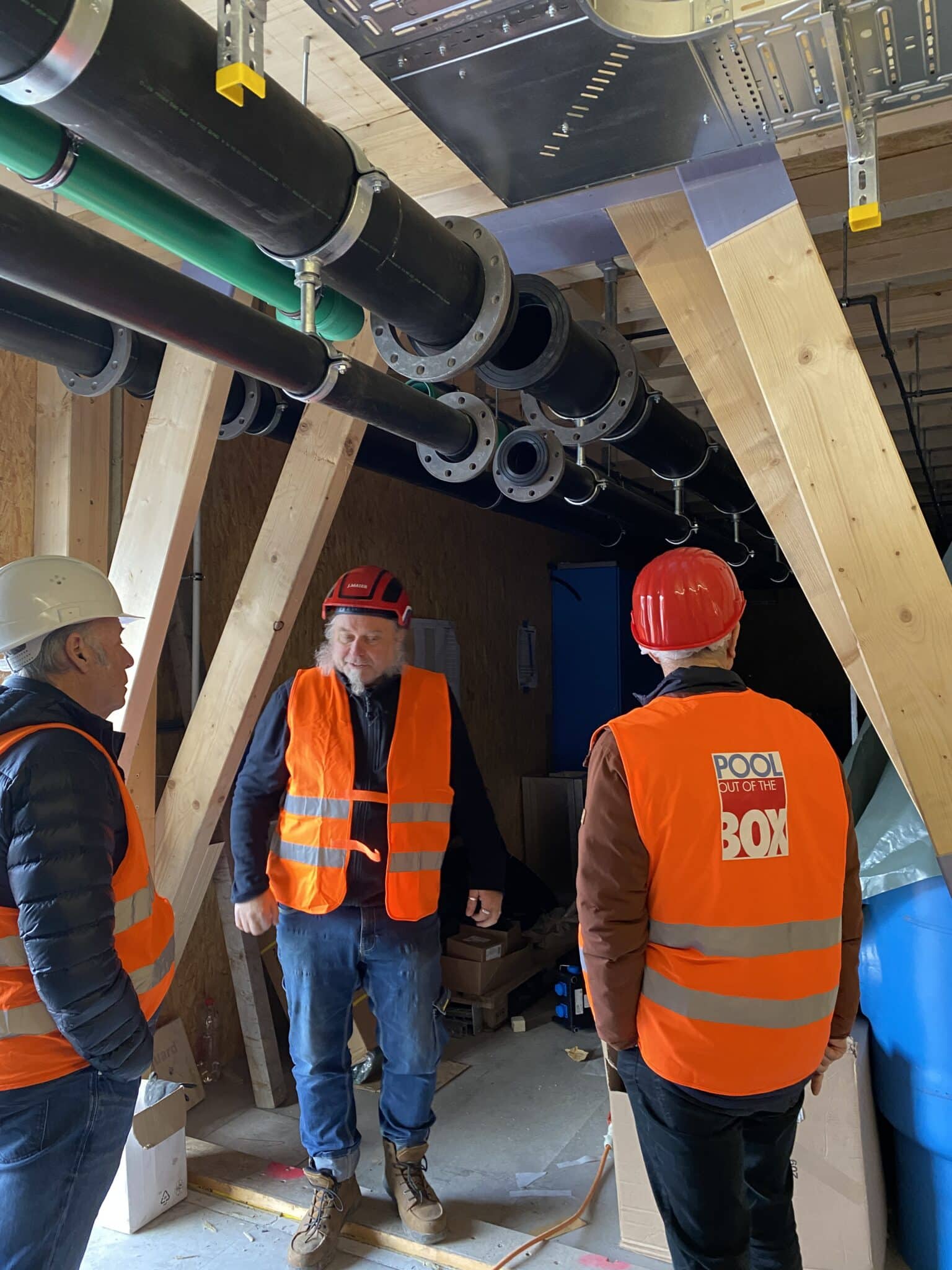 Der Baukörper steht bereits vollständig, das Edelstahl‑Becken ist installiert, Fenster und Dach sind dicht – der Bau vermittelt bereits die räumliche Wirkung des Bades. Nun liegt der Fokus auf den Ausbauarbeiten im Inneren: Oberflächen, Innenausbau und die Verbindung der bereits im Werk verbauten technischen Geräte.