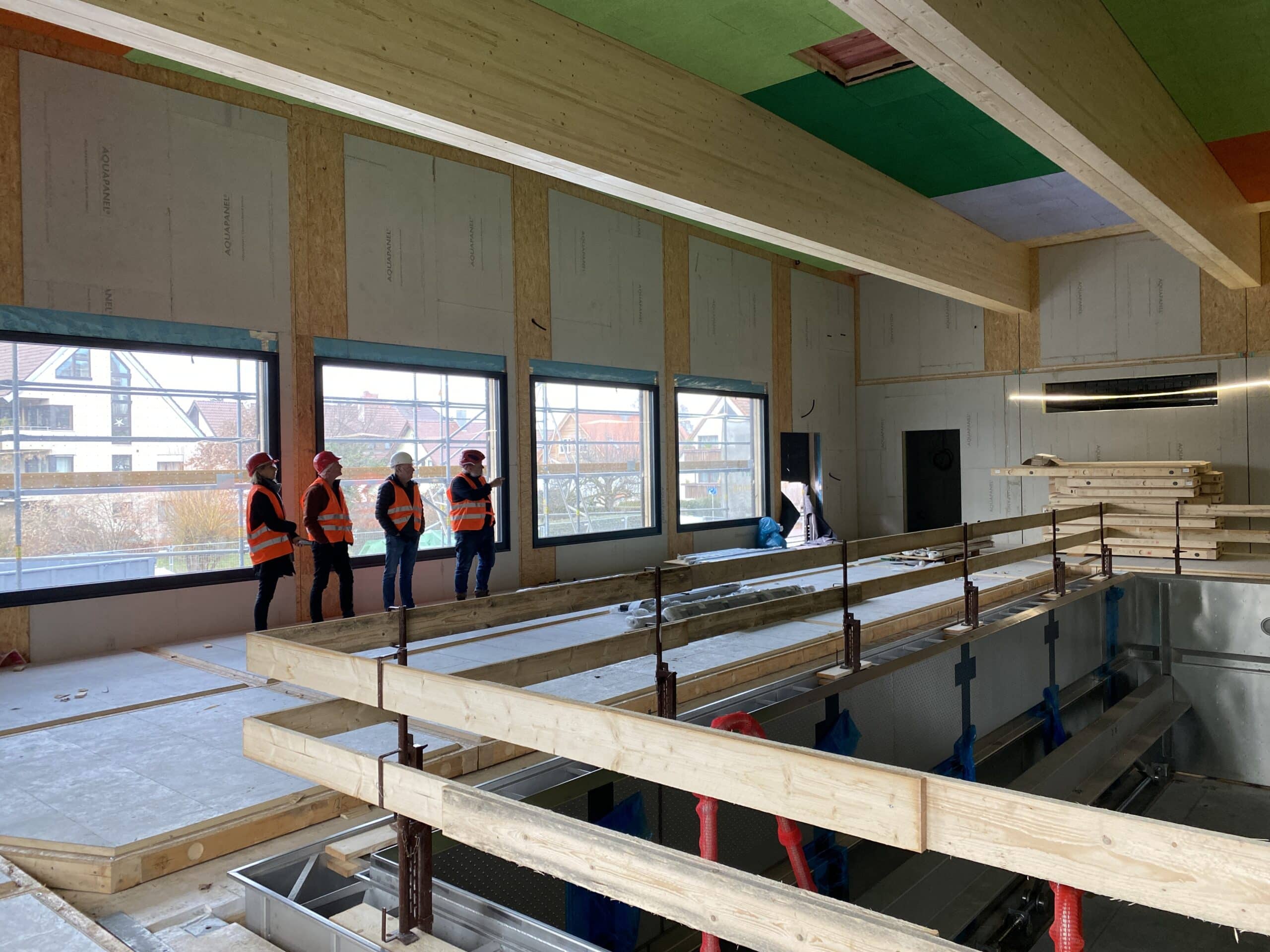 Der Baukörper steht bereits vollständig, das Edelstahl‑Becken ist installiert, Fenster und Dach sind dicht – der Bau vermittelt bereits die räumliche Wirkung des Bades. Nun liegt der Fokus auf den Ausbauarbeiten im Inneren: Oberflächen, Innenausbau und die Verbindung der bereits im Werk verbauten technischen Geräte.