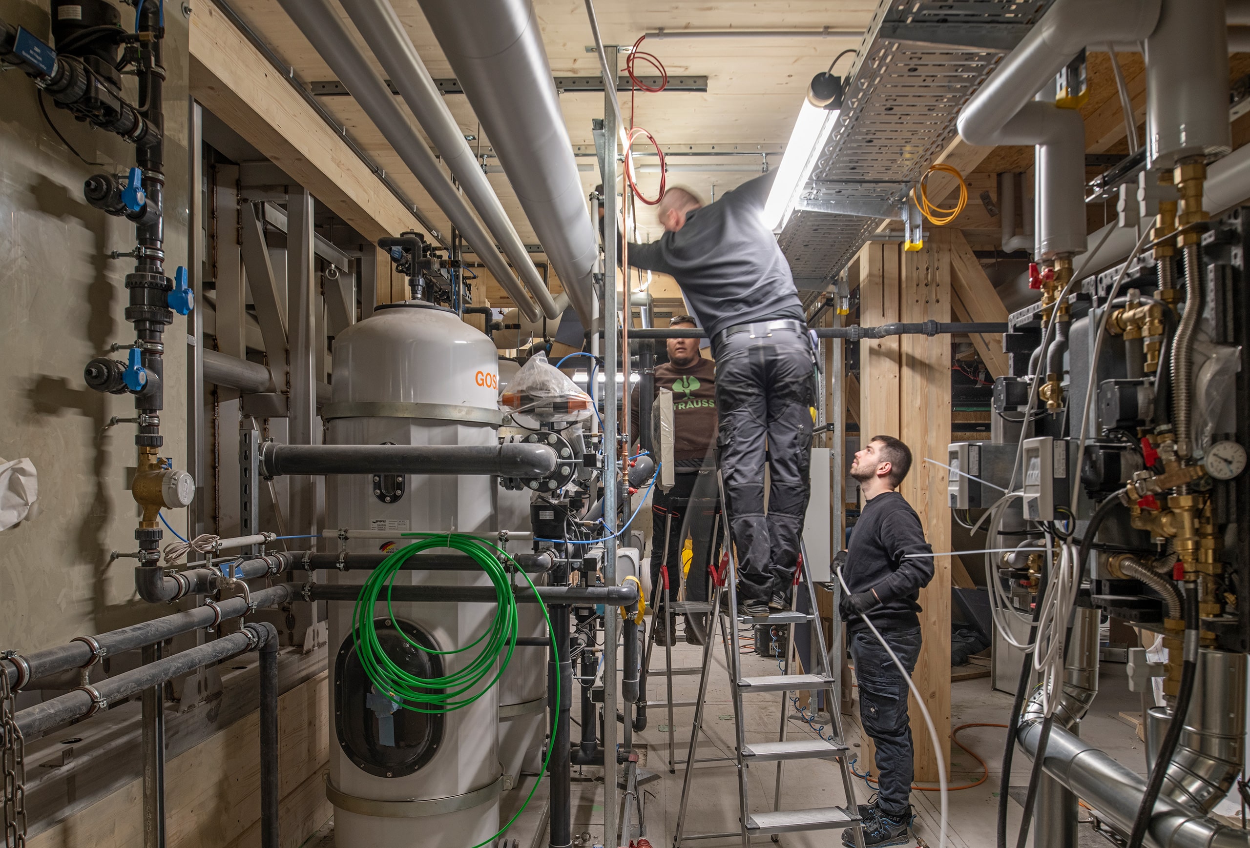 Die Aquabox basiert auf einem hohen Vorfertigungsgrad: Insgesamt 46 Holzmodule wurden weitgehend fertig ausgebaut in Werkhallen produziert und vor Ort innerhalb kurzer Zeit montiert. Diese Bauweise reduziert nicht nur die Bauzeit erheblich, sondern auch Materialverbrauch und Abfall auf der Baustelle. Neben der Konstruktion aus Holz trägt auch die technische Ausstattung zur Klimafreundlichkeit des Projekts bei: Wärmepumpen, eine Lüftungsanlage mit hoher Wärmerückgewinnung sowie eine Photovoltaikanlage auf dem Dach sorgen für einen energieeffizienten Betrieb.