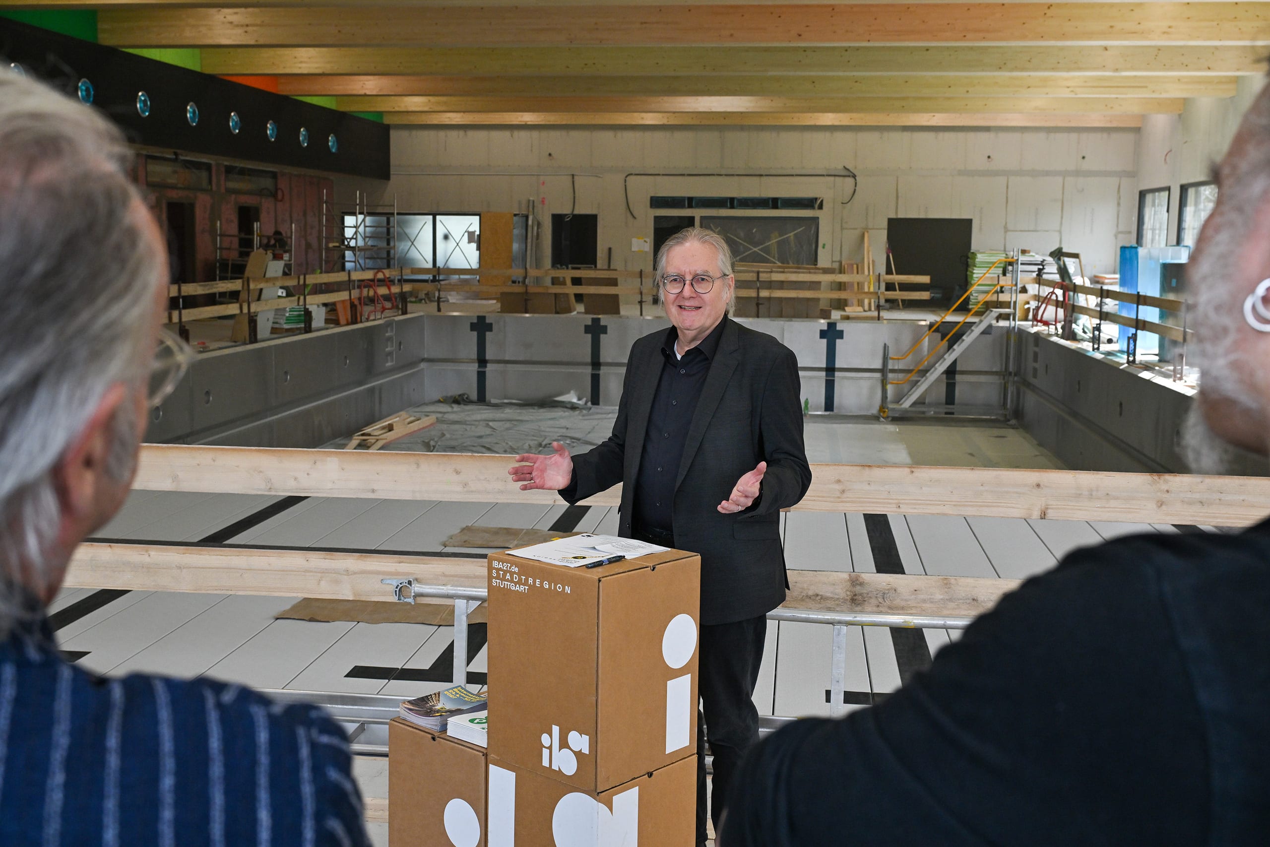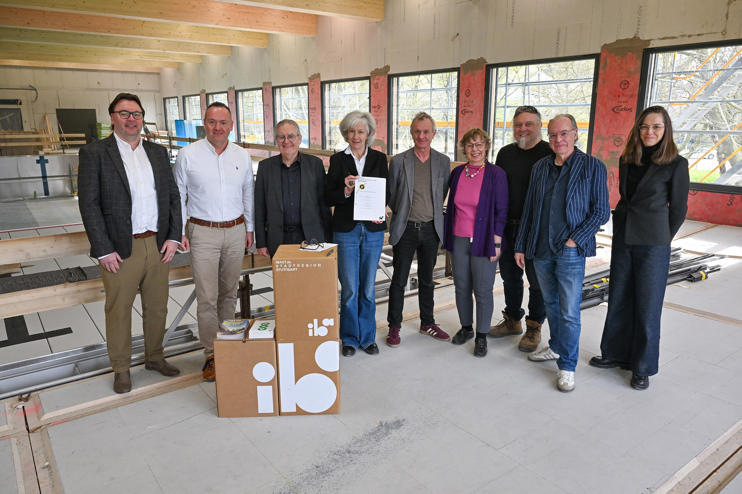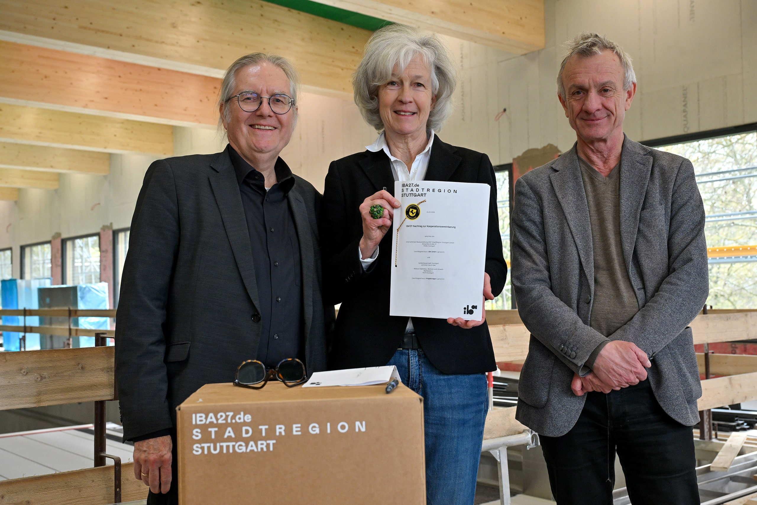 Die Internationale Bauausstellung 2027 StadtRegion Stuttgart (IBA’27) und die Landeshauptstadt Stuttgart haben bei einem Pressetermin am Dienstag, 24. März 2026, eine Kooperationsvereinbarung für das mobile Hallenbad »Aquabox« unterzeichnet. Damit ist das Vorhaben eines von nun 37 offiziellen IBA’27-Projekten. Mit dem innerhalb weniger Wochen aus vorgefertigten Holzmodulen errichteten Gebäude entsteht in Stuttgart ein europaweit neuartiger Gebäudetyp: ein versetzbares Hallenbad in Holzmodulbauweise, das flexibel an verschiedenen Standorten eingesetzt werden kann.
