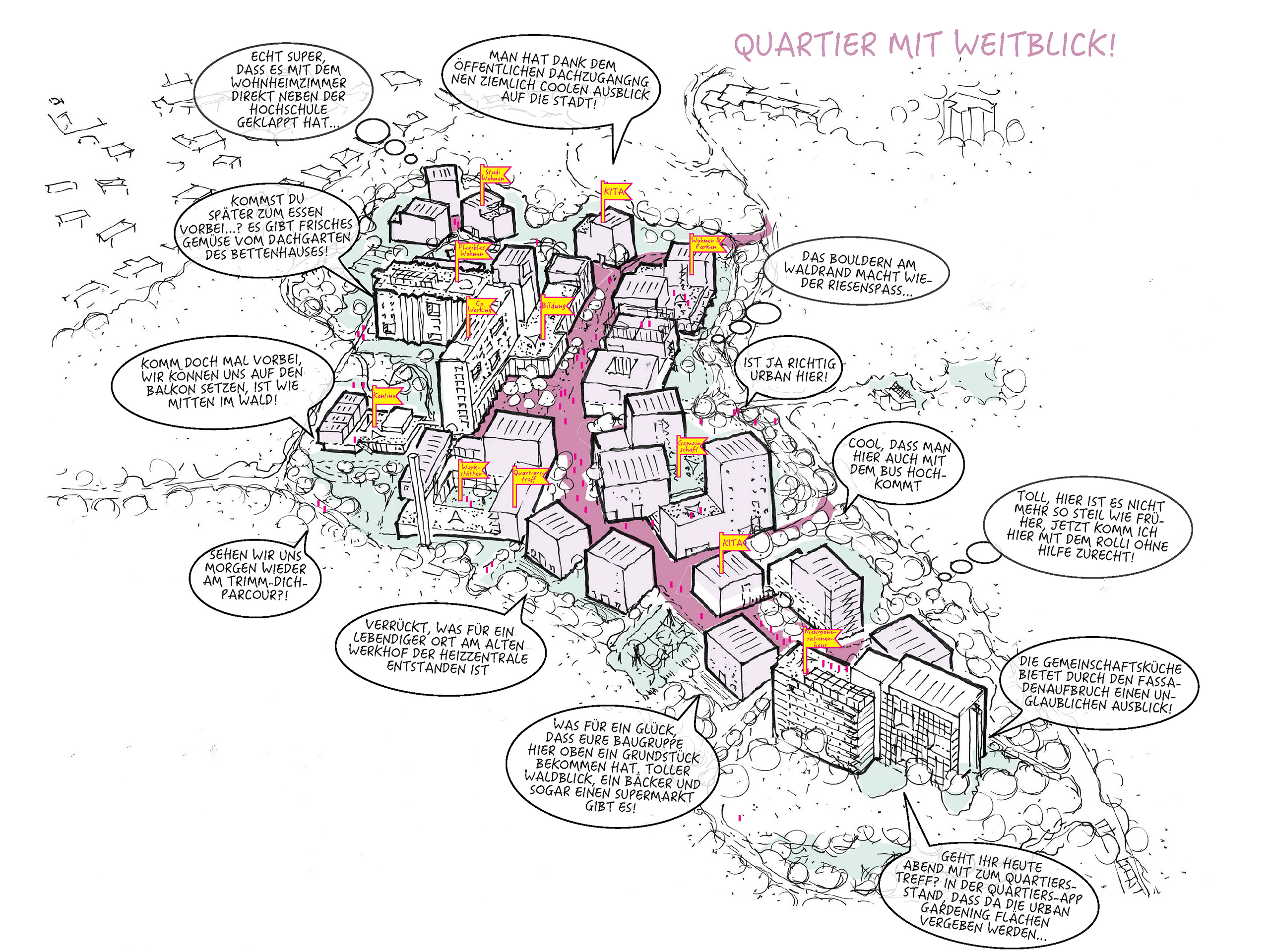Zum einen, ließe sich antworten, weil die im Hinblick auf Zusammenleben, Nutzungsvielfalt und neue Wohnformen hoch gesteckten Ziele der Stadt sich im festen Rahmenwerk etablierter Planungsprozesse und baulicher Zielbilder nur schwer erreichen lassen. Ein Prozess nach dem Prinzip von Versuch und Irrtum, angetrieben von den tatsächlichen Bedürfnissen vor Ort, könnte dagegen Raum für tatsächliche Innovation bieten. Zum anderen könnte sich eine prozessgetriebene Quartierentwicklung – auch wenn sie mehr Anschubenergie und Vorinvestitionen erfordert – als nachhaltiger erweisen, weil sich im neuen Quartier nur das etabliert, was auch tatsächlich gewollt und notwendig ist. Unbelebte Plätze, leere Cafés und serbelndes Kleingewerbe in Neubauquartieren – das alles sind altbekannte Folgen von städtebaulichen Konzepten, die gestalterisch zwar überzeugen mögen, die Nachfrage und die Bedürfnisse vor Ort jedoch verkennen.