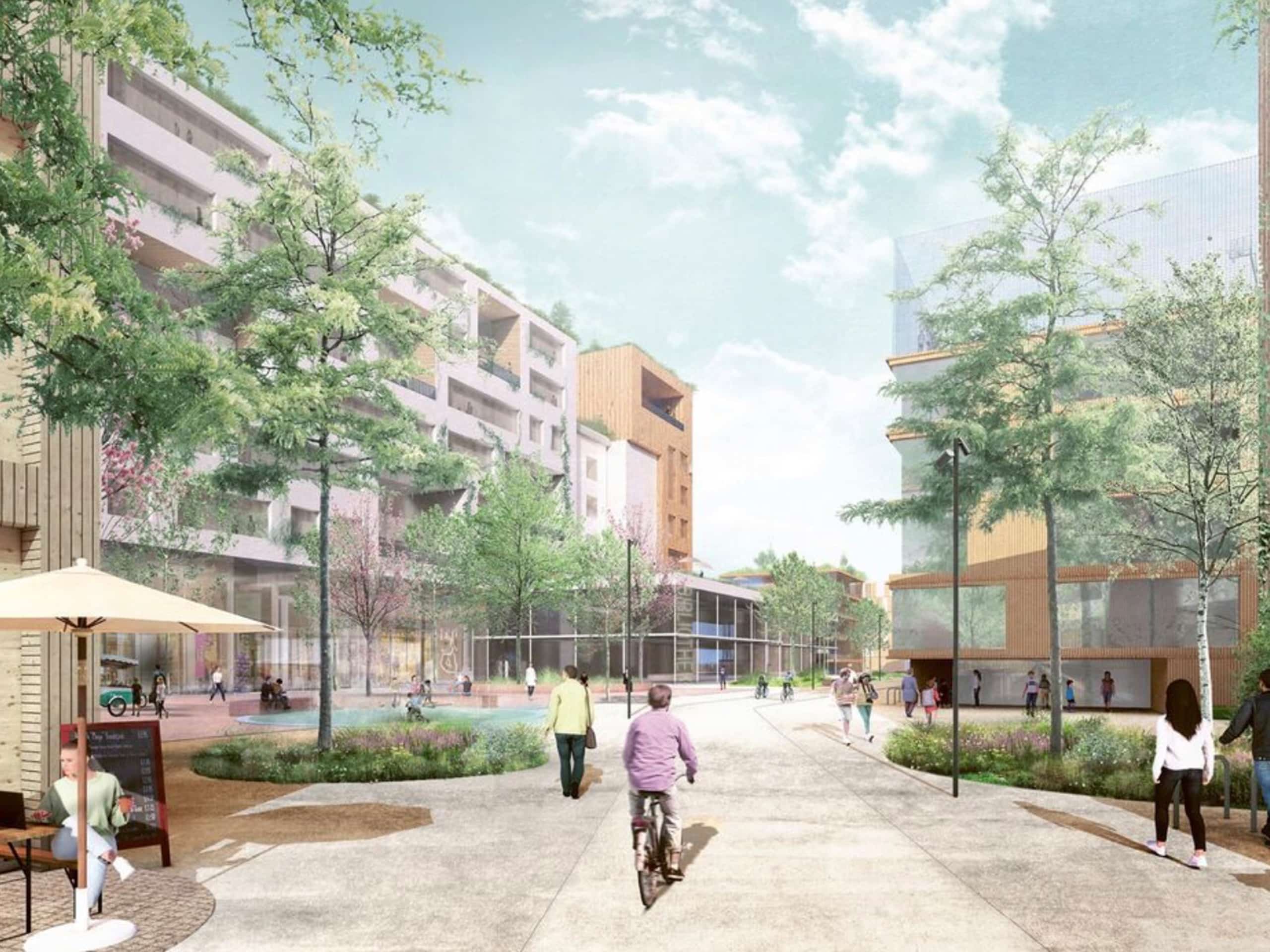 Der künftige Quartiersplatz, von Westen her gesehen. (Visualisierung: Studio Wessendorf )
