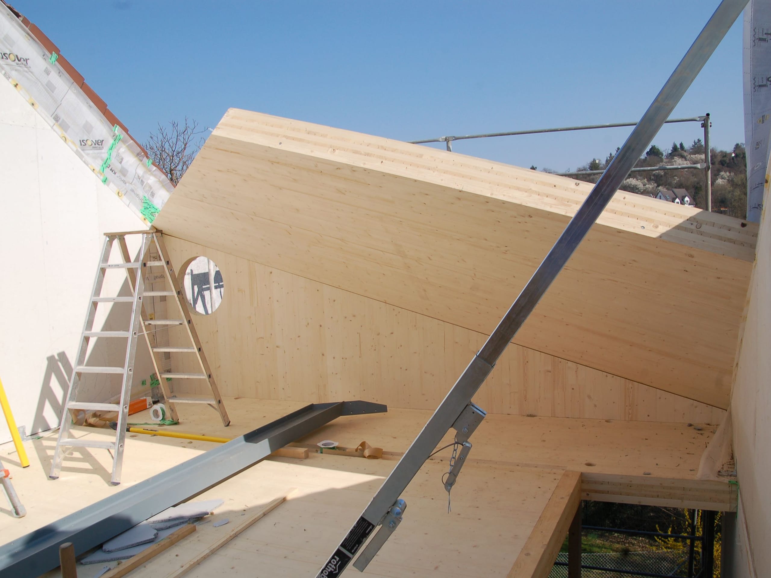 Das Untergeschoss besteht aus gedämmten Betonfertigteilen, die oberen Geschosse aus Holz. Viele Oberflächen bleiben sichtbar und unbehandelt, Bauteile sind verschraubt und gut zugänglich. Dies erleichtert spätere Anpassungen und einen möglichen Rückbau. Großzügige, gut gedämmte Fenster, eine vollständig mit Photovoltaik belegte Dachfläche und eine einfache Haustechnik ermöglichen einen sehr niedrigen Energiebedarf bei gleichzeitig hohem Eigenstromertrag.