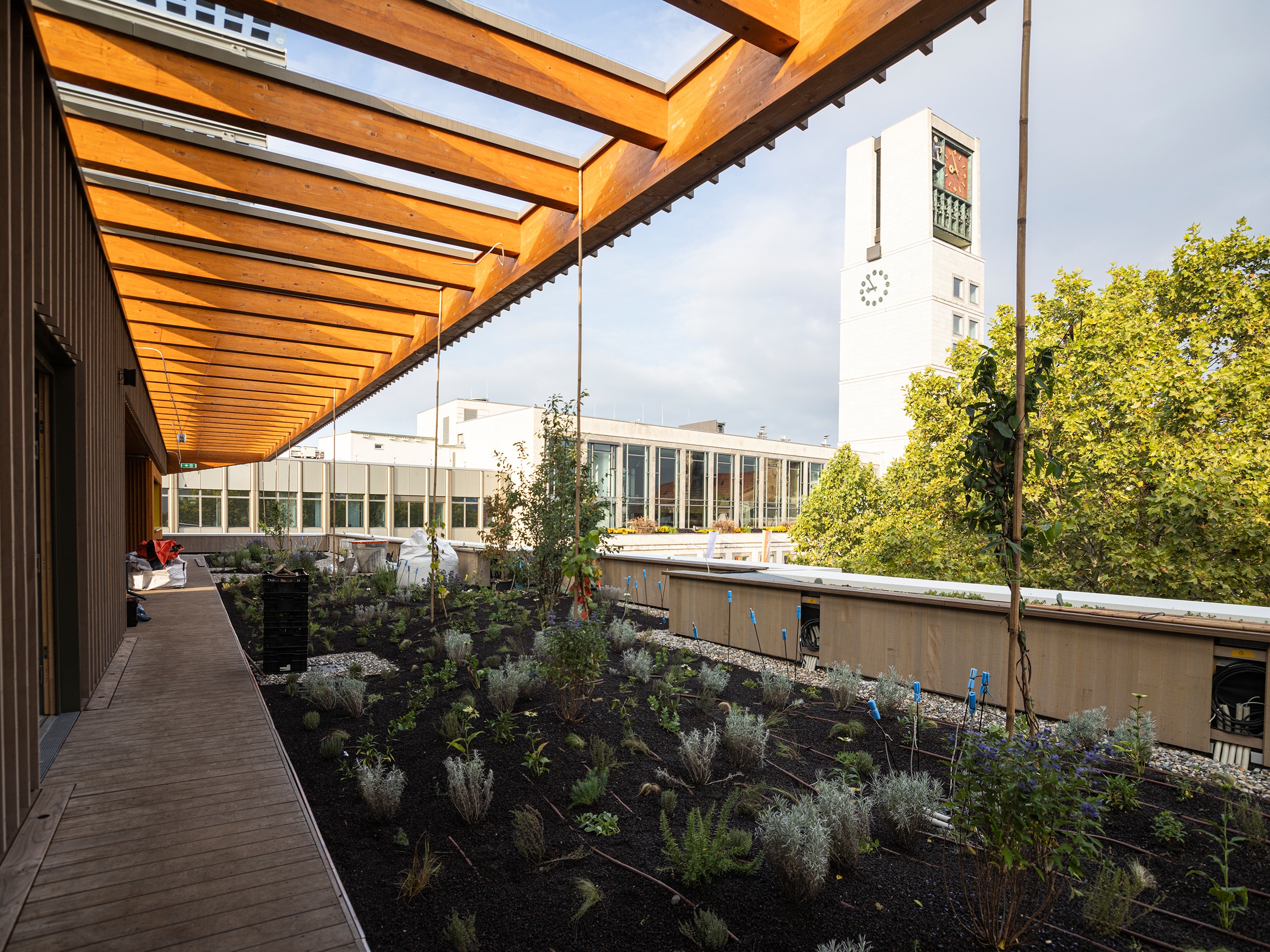 Die Umgestaltung setzt auf nachhaltige Bauweisen und transformiert das ehemalige Kaufhaus zu einem offenen, flexiblen Gebäude. Eine transparente Fassade öffnet das Gebäude zum Marktplatz, während begrünte Seitenflächen das Mikroklima verbessern und zur Aufenthaltsqualität in der Innenstadt beitragen. Nach der vollständigen Entkernung und Schadstoffsanierung wurde ein neues Treppenhaus aus R-Beton ergänzt, während Decken, Aufstockung und Außenwände in Holzbauweise entstehen. Das gesamte Gebäude folgt den Prinzipien des zirkulären Bauens: Der Bestand bleibt erhalten, es kommen biobasierte Materialien zum Einsatz, und die hinterlüftete Fassade ersetzt herkömmliche Wärmedämmverbundsysteme. Photovoltaik ist integraler Bestandteil des Energiekonzepts. Das Gebäude erreicht den KfW-40-Standard und senkt durch die Bestandserhaltung die CO₂-Emissionen um 25–30 Prozent im Vergleich zu einem Neubau.