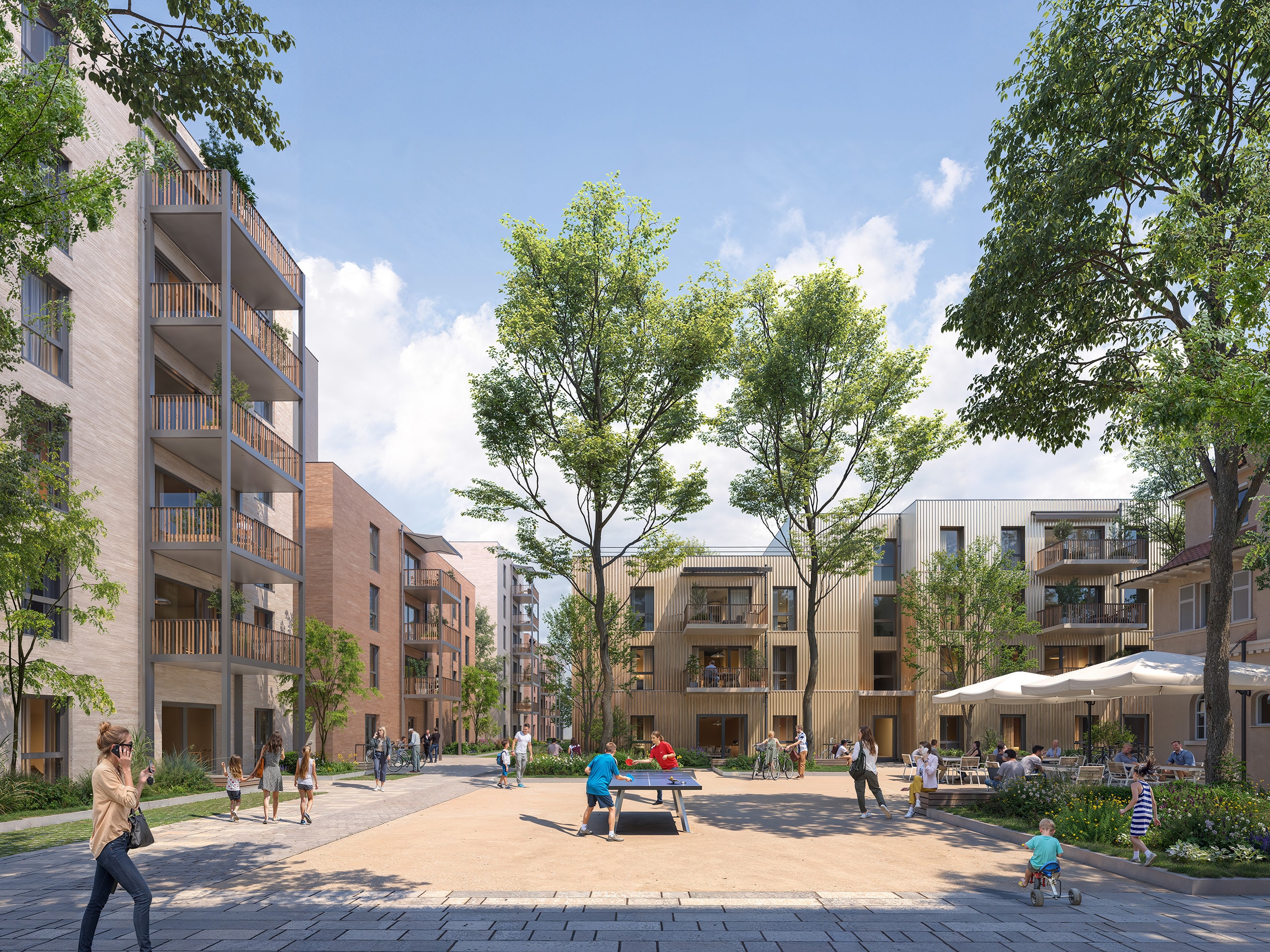 Geplant sind rund 156 Wohnungen, überwiegend geförderte Mietwohnungen mit ein bis vier Zimmern. Die serielle, nicht unterkellerte Bauweise verkürzt die Bauzeit und reduziert die Kosten. Ergänzend entstehen zwei Quartiersplätze als öffentliche Treffpunkte, ein Quartiersraum, gemeinschaftlich genutzte Fahrrad- und Waschräume sowie eine Arztpraxis. Weitere Gewerbeflächen befinden sich in einem Gebäude am nördlichen Platz, das direkt von der Stadt vermarktet wird. Die Stellplätze sind in einer Parkgarage mit Mobilitätszentrum gebündelt.