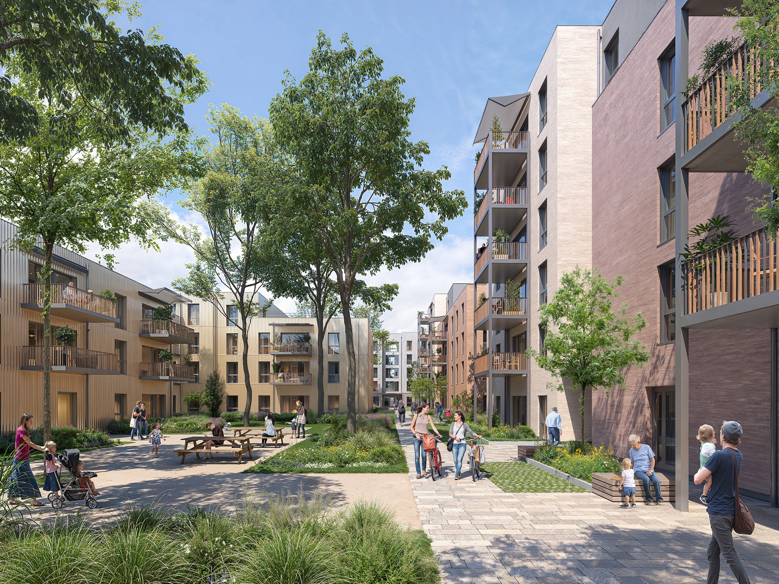 Zwei begrünte Wohnhöfe bilden das Herz des Quartiers und schaffen Aufenthaltsqualität und Raum für Begegnung. Dachbegrünungen, Regenwassermanagement, wasserdurchlässige Beläge, Photovoltaikanlagen und insektenfreundliche Beleuchtung tragen zum Klimaschutz bei. Zusätzliche Grünflächen mit Bäumen und Sträuchern sowie eine reduzierte Stellplatzquote mit E-Ladestationen unterstreichen den Anspruch, ressourcenschonend und zukunftsfähig zu bauen.