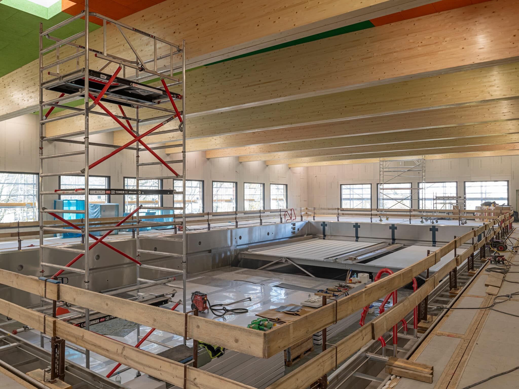 In Stuttgart-Zuffenhausen überbrückt ein Interimsbad aus vorgefertigten Holzmodulen die Neubauphase des örtlichen Hallenbades. Als wiederlösbares Baukastensystem kann es nach Fertigstellung klimaschonend rückgebaut und zur Weiternutzung an einen anderen Sanierungsstandort versetzt werden.