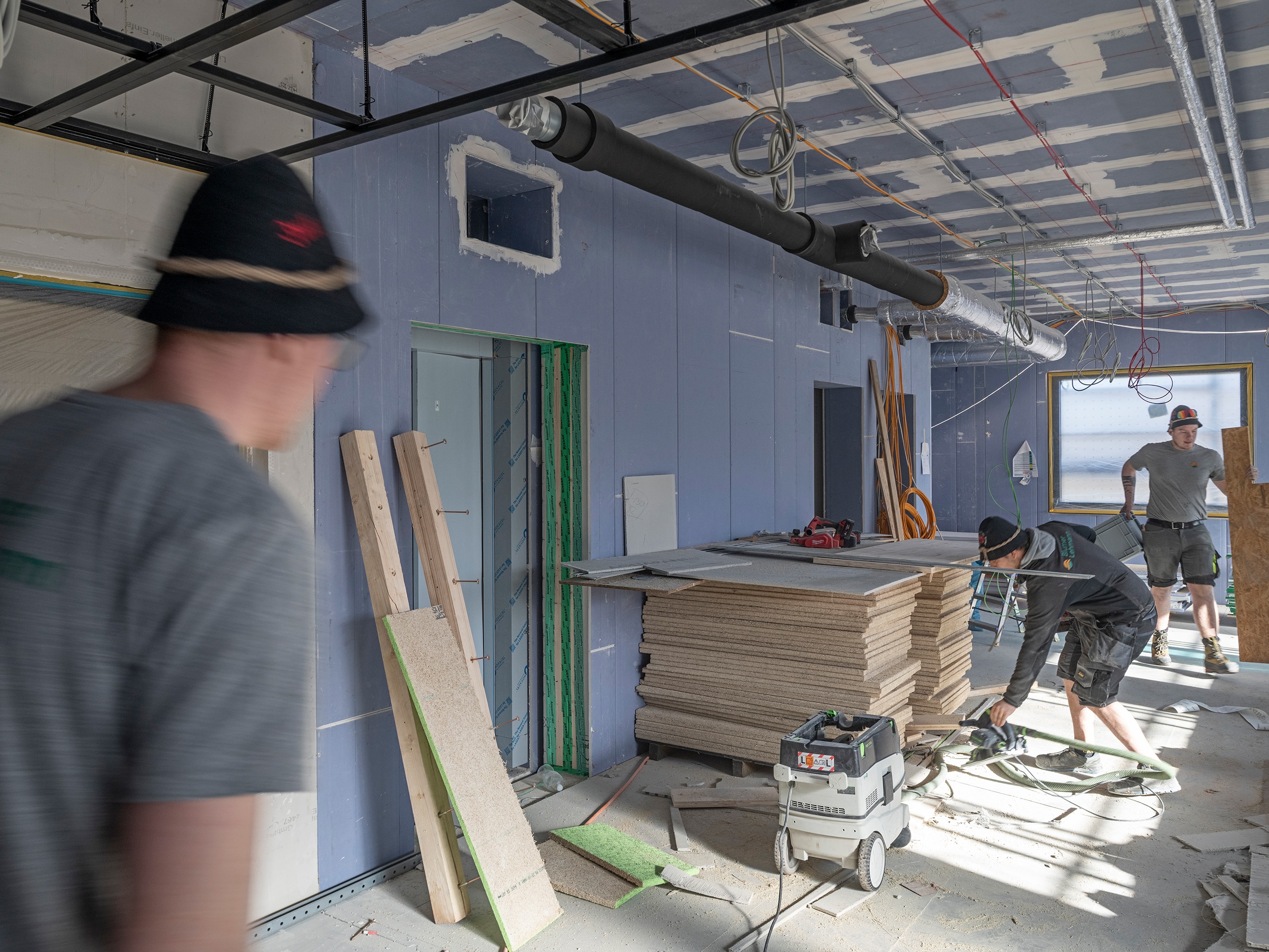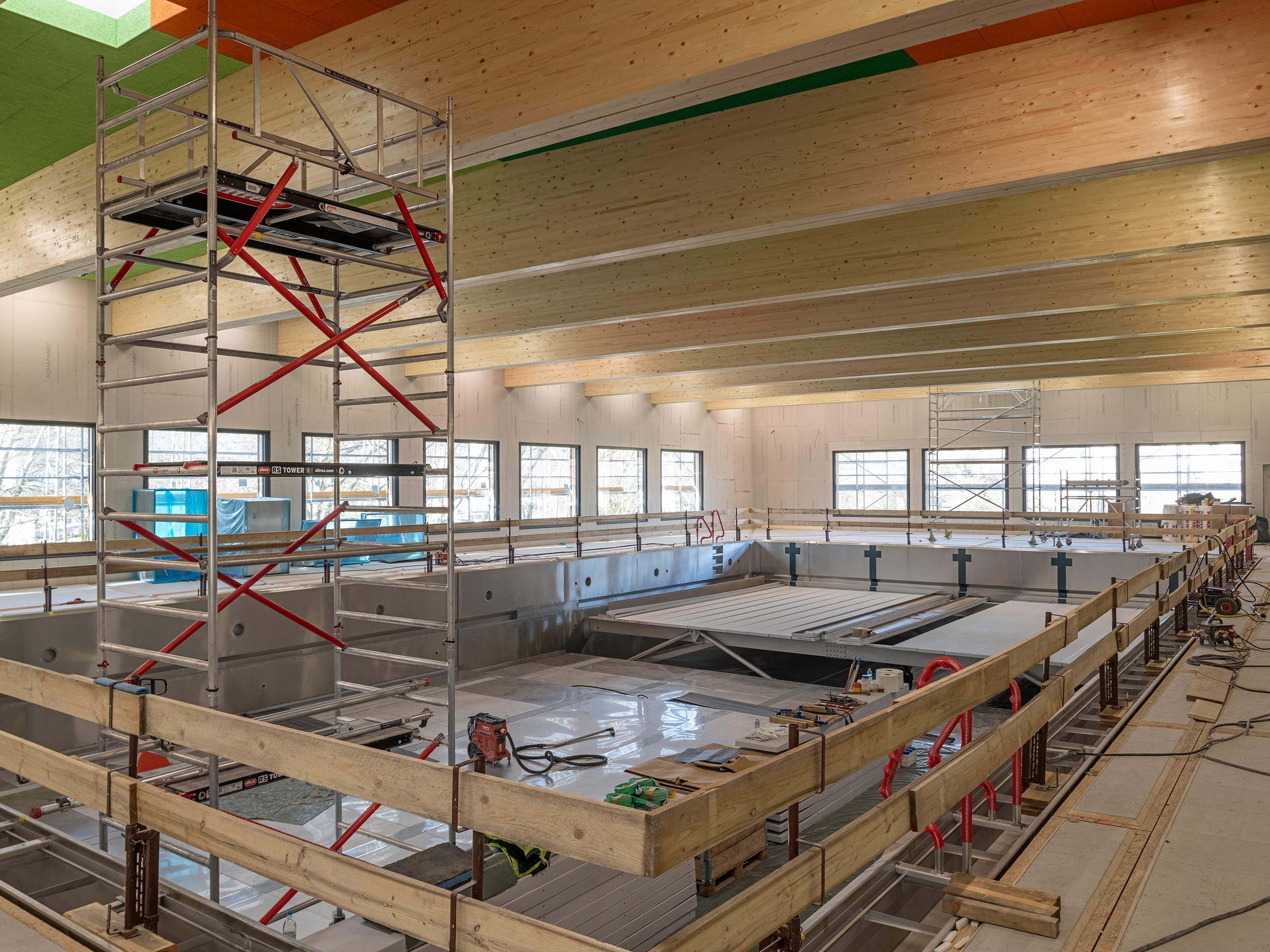 Unweit ihres vertrauten Stadtteilbades stehen Familien, Schulkinder und Schwimmer:innen beim Zuffenhausener Kelterplatz neuerdings einem markanten, zweigeschossigen Holzgebäude gegenüber. Es ist das Ergebnis eines Vergabeverfahrens, in dem der städtische Eigenbetrieb Stuttgarter Bäder eine temporäre Lösung für die Rück- und Neubauphase des bestehenden Hallenbades aus den 1970er-Jahren suchte. Damit insbesondere der Schwimmunterricht während der Errichtung des notwendigen Ersatzneubaus nicht ausfallen muss, entwickelte ein interdisziplinäres Team aus Planer:innen und Holzbauunternehmen ein modulares Hallenbad, das sich innerhalb weniger Wochen errichten lässt: Raumelemente in Holzrahmenbauweise werden nahezu vollständig und wetterunabhängig in einer Werkshalle vorproduziert, technisch ausgerüstet und fertig möbliert auf die Baustelle geliefert, was Errichtungszeit und Abfälle stark reduziert. Auch die vorab eingebauten Schwimmbeckenelemente aus Edelstahl müssen beim Aufbau nur noch verschweißt werden. Wärmepumpen, Lüftung mit hoher Wärmerückgewinnung und Photovoltaik auf dem Dach reduzieren den Energiebedarf des mobilen Hallenbads und machen den Betrieb deutlich klimafreundlicher als bei konventionellen Schwimmhallen. Vor Ort aufeinandergesetzt und verschraubt, bilden die 46 Holzmodule einen charakteristischen Kubus, dessen farbige Eingangswand die Besucher:innen zukünftig zum Empfangsbereich im Erdgeschoss führt. Im Obergeschoss können die Badegäste gleichzeitig ungestört ihre Bahnen im 25-Meter-Becken schwimmen oder im Bereich mit Hubboden im flachen Wasser planschen und dabei den Blick in die Baumkronen genießen. Ist der angrenzende Schwimmbadneubau fertiggestellt, zieht das mobile Bad weiter zu den nächsten Hallenbadbaustellen in Stuttgart. Damit zeigt das Pilotprojekt einen zukunftsfähigen Weg für flexible und zirkulär nutzbare Übergangsbauten.