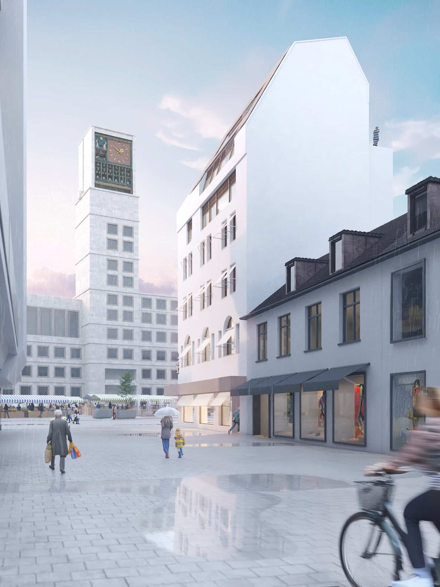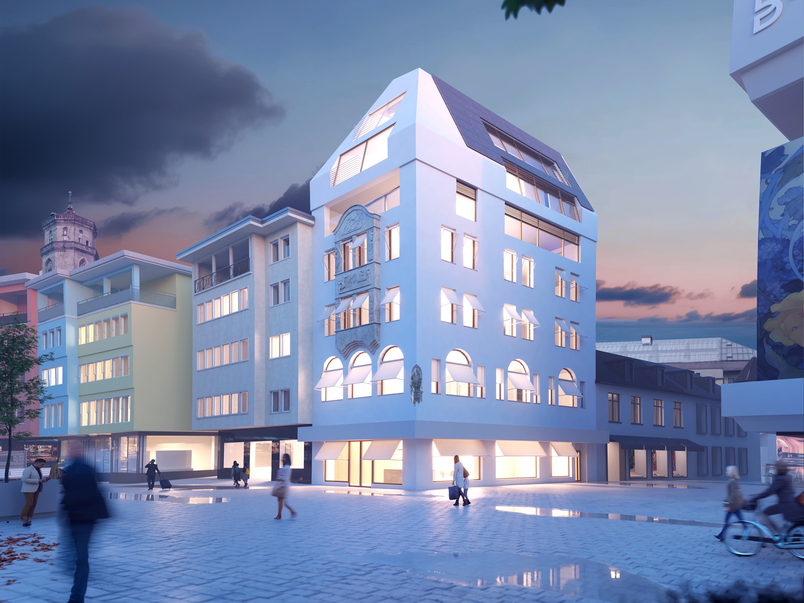 Das Erd- und Untergeschoss werden als Ausstellungs- und Verkaufsflächen genutzt. In den oberen Etagen entstehen flexible Räume, die je nach Bedarf genutzt werden können. Ein neuer Aufzug erschließt alle Etagen barrierefrei. Besonderes Augenmerk liegt auf den historischen Elementen. Der Erker mit den Sieben Schwaben und die Hans-Sachs-Figur werden behutsam restauriert. Neue Sandstein-Fensterbänke und eine überarbeitete Fassade ab dem ersten Stock sorgen für ein klares Gesamtbild. Dach und Fassade werden in der gleichen Farbe gehalten. So wirkt das Gebäude einheitlich und fügt sich prägnant in die Reihe am Marktplatz ein. Die energetische Sanierung umfasst eine Wärmepumpe, eine PV-Anlage, neue Fenster mit Sonnenschutzverglasung, außenliegenden Sonnenschutz, Innendämmung im Bestand sowie hochgedämmte Aufbauten im Dachbereich.