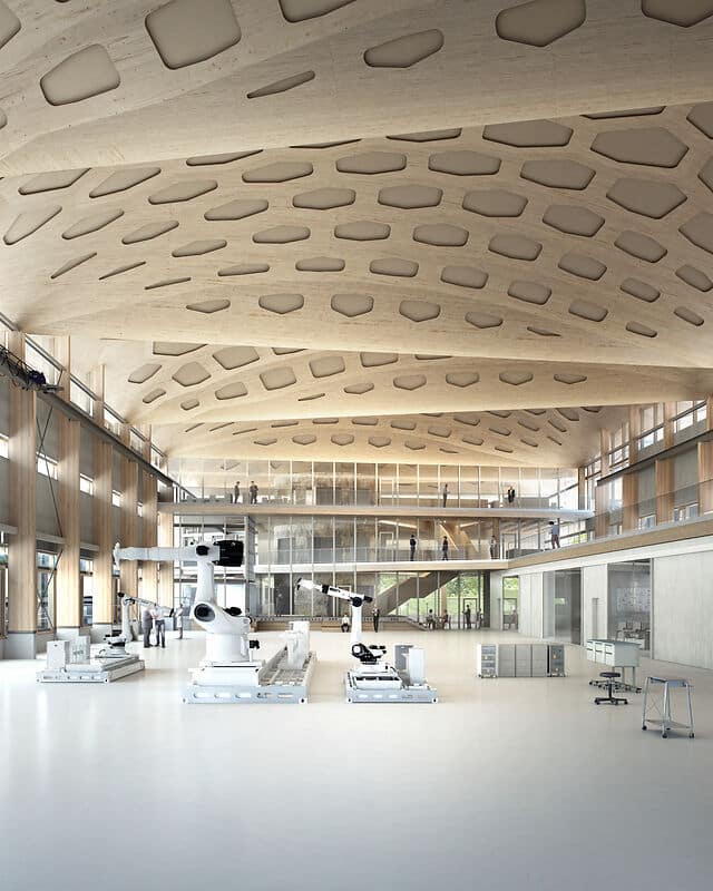 Visualisierung des Forschungsneubaus »IntCDC Building« der Universität Stuttgart für das Architektur-/Bau-Exzellenzcluster IntCDC (Bild: IntCDC Planungs GmbH)